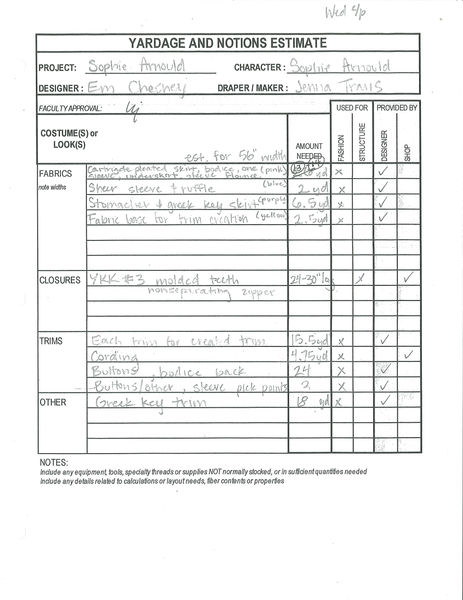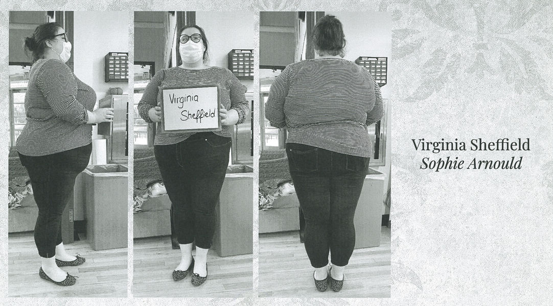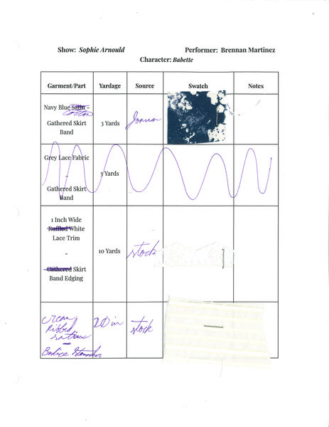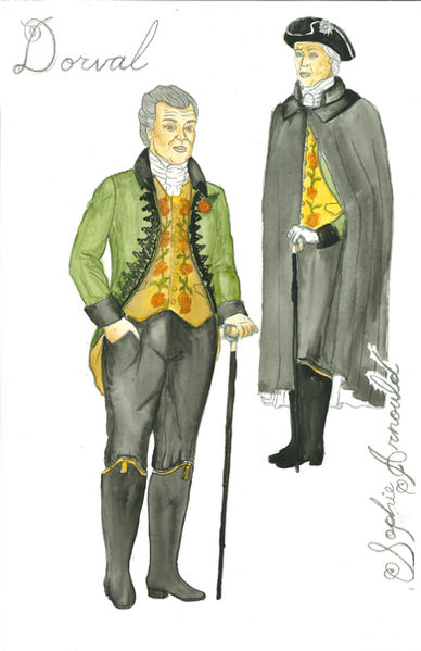 The general concept for the costume design is focused on historical accuracy with a throughline of floral motifs. The centerpiece is a pink and green gown that Sophie dons as she and Dorval reminisce. It is one of her old performance gowns; specifically the one she wore when portraying her more popular ancient Greek character roles, like Eurydice and Iphigenia. From the color palettes to the individual types of floral motifs used in each costume, nearly every part of these costumes are meant to be highly symbolic, evoking not just cold memory, but near-forgotten emotion and passion as well.